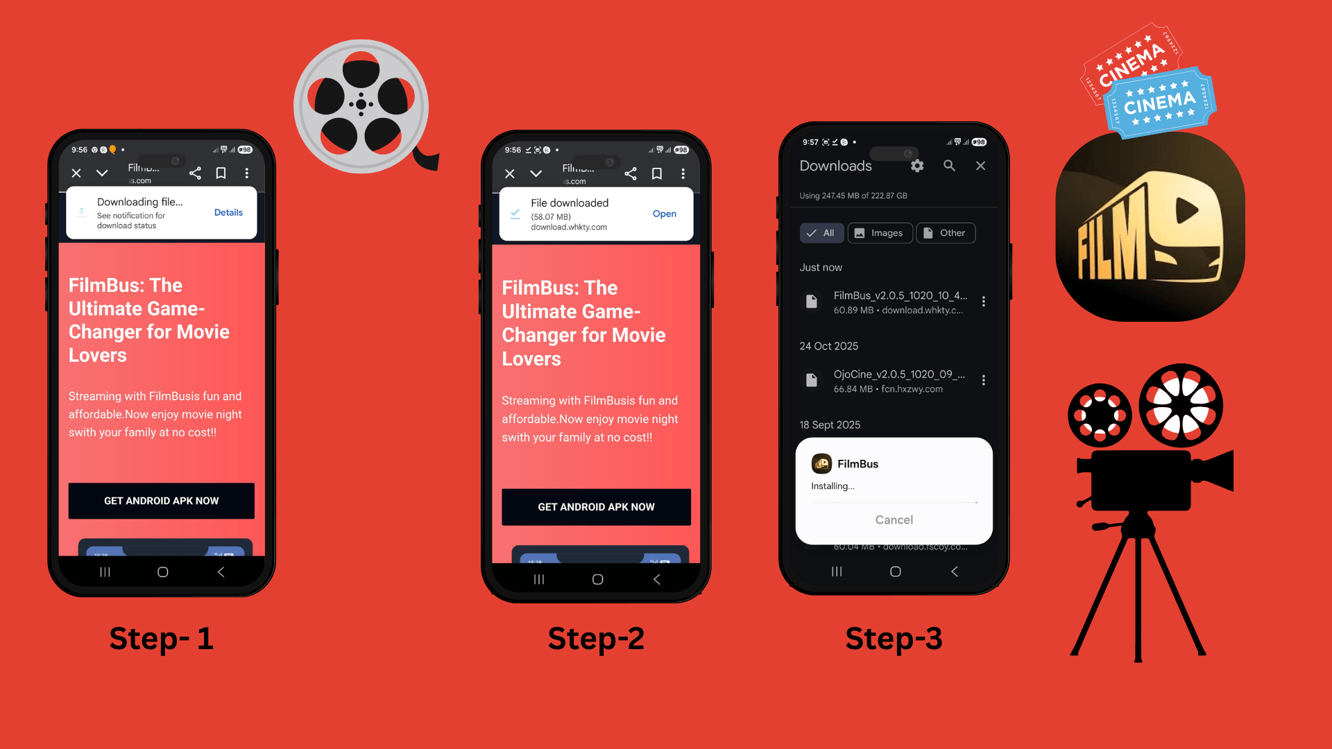 After getting the file on your computer, installing FilmBus on your smartphone is an easy step-by-step process as shown below.